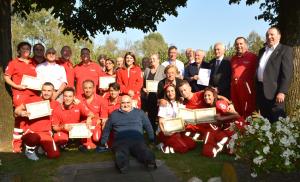 Trecate - Domenica dedicata alle premiazioni per il Comitato della Croce Rossa di Trecate, riunitosi alla mattina per partecipare alla Messa delle 11.15 concelebrata da don Alessandro e don Mauro. Al termine della funzione religiosa c’è stata l’inaugurazione di un’ambulanza e di un supporto per persone con problemi di deambulazione. Quindi l’atteso pranzo sociale alla presenza di Tonino Calvano (presidente CRI Piemonte), Livio Chiotti (presidente CRI Cuneo), Antonio Pellizzari (presidente CRI Novara), Carla Zucco (sindaco Sozzago), assessori Massimo Fusetto e Roberto Minera (rispettivamente per Cerano e Trecate) oltre a Claudio Duranti (presidente CRI Trecate) e Augusto Galli (ex presidente CRI Trecate). Nel corso del pranzo si sono svolte le premiazioni per i volontari della Cri trecatese da 1, 5, 15, 20, 25, 30 e 35 anni. A conclusione la donazione alla CRI di un quadro di grande formato da parte del pittore e volontario Riccardo Borando.