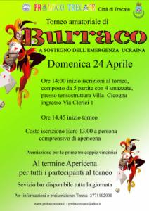 Domenica 24 aprile invece spazio per il Torneo di Burraco che avrà luogo in Villa Cicogna, sede Operativa della Pro Loco Trecate. Le iscrizioni sono aperte dalle ore 14; si comincia a giocare dalle 14.45. Costo iscrizioni a persona: 13 euro (comprensivo di apericena). Per iscrizioni contattare il sito web della Pro Loco Trecate oppure telefonare al 371 1102000. Parte del ricavato del torneo sarà devoluto per l'Emergenza Ucraina.