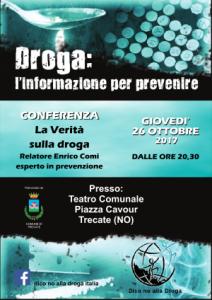 Trecate - Giovedì 26 ottobre alle ore 20.30 verrà tenuta a Trecate, presso il Teatro Comunale, una conferenza pubblica dal titolo: DROGA – INFORMAZIONE PER PREVENIRE. I volontari dell 'Associazione Dico NO alla droga, operano nell'ambito della prevenzione, con lo scopo di sensibilizzare i giovani sulle conseguenze derivanti dall'uso ed abuso di droga, al fine di favorire una maggiore consapevolezza e una scelta orientata verso una vita libera da queste sostanze tossiche. Vogliamo ricordare che le informazioni sono trasmesse attraverso: convegni, conferenze, una serie di opuscoli che trattano nello specifico le droghe maggiormente usate, le conseguenze a livello psicofisico, e la testimonianza di chi ne ha fatto uso oppure un DVD con spot e un documentario strutturato per fornire dati e informazioni su come funzionano queste sostanze, gli effetti e le conseguenze sulla vita.