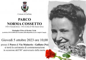 Galliate - Il Consigliere Norma Porzio già proponente del progetto per l'intitolazione del parco pubblico comunale situato in Via Mainerio e all'avvenuta apposizione della targa a ricordo di Norma Cossetto, organizza con il supporto di tutta l'amministrazione, la cerimonia di commemorazione in occasione dell'80° anniversario della morte della giovane, in data 5 ottobre alle ore 10. In presenza delle Autorità, del Parroco e di quanti desidereranno intervenire, sarà deposta una rosa in prossimità della targa nell’omonimo parco a lei dedicato, in ricordo del sacrificio della giovane studentessa istriana. Si ringrazia "La Bottega del Fiore" di Gaio Domenico di Galliate.