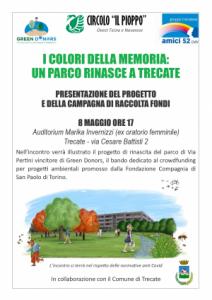 Trecate - Sabato 8 maggio alle 17, all’auditorium Marica Invernizzi (ex oratorio femminile) in via Cesare Battisti, si svolgerà l’incontro “I colori della memoria: un parco rinasce a Trecate”, presentazione del progetto relativo al parco di via Pertini e della campagna di raccolta fondi ad esso collegata. «Il parco di via Pertini, che sarà intitolato alle vittime da Covid-19, è pronto a vivere un momento importante del percorso di riqualificazione avviato nello scorso autunno. Il sentito ringraziamento dell’Amministrazione va innanzitutto a Legambiente, Circolo “Il Pioppo” Ovest Ticino e Novarese, promotore del progetto, e al Gruppo Trecatese Amici 52 OdV – dichiarano il Sindaco Federico Binatti e l’assessore all’Ambiente Roberto Minera – L’incontro verterà sul progetto di rinascita del parco, vincitore del bando della Fondazione Compagnia San Paolo di Torino “Green Donors”, che punta sul coinvolgimento della comunità di riferimento per il buon andamento del progetto e per il raggiungimento del risultato finale».