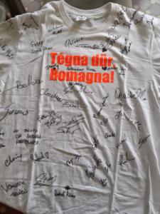 Il Comune di Russi ha inoltre pubblicato le immagini della maglietta, inviata insieme con la donazione di 4.000 euro, “creata per l’occasione, sui cui spiccano le firme dei cittadini che hanno partecipato alla serata” del 10 giugno. "Le firme – dicono con un pizzico di commozione l’assessore Fortunata Patrizia Dattrino e il consigliere Michela Cigolini, promotrici dell’iniziativa – in realtà non sono tutte, dal momento che “Tégna dūr, Romagna! Trecate c’è” ha visto la presenza di oltre cinquecento persone, un successo di solidarietà per l’intera comunità trecatese. Siamo orgogliosi di aver potuto contribuire alla ripresa del paese della provincia di Ravenna che abbiamo individuato grazie al coordinatore provinciale dell’Associazione nazionale Alpini-Protezione Civile Adriano Nestasio, trecatese, che, come viene ricordato nello stesso post, “ha operato a Russi e ha raccontato ai suoi concittadini dell'estrema difficoltà vissuta dalla popolazione in quei giorni”. Ora aspettiamo, dopo l’estate, di poter organizzare una visita ufficiale a Russi. Che dire? Grazie – concludono l’assessore e il consigliere - a chi ci ha dato l’opportunità di fare una buona azione e di dimostrare, ancora una volta, che Trecate ha un cuore davvero grande".