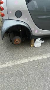 Trecate - Tornano in azione i ladri di... gomme. Un paio di anni dopo infatti i soliti ignoti sono tornati in azione a caccia di pneumatici. La vittima di turno è C.E., un giovane trecatese, cui hanno portato via una gomma dalla sua Smart posteggiata nei pressi di casa sua. Racconta: "Questa mattina, domenica 8 gennaio, mi sono ritrovato in via Adige (quartiere San Bernardo) con una sorpresa di questo tipo! Sono tante le cose che ti passano per la mente in pochissimi secondi, ma sicuramente è una vergogna! A te, a voi che avete compiuto questo gesto non vi auguro del male, ma nemmeno del bene: sia la vostra stessa vita a replicare ciò che di brutto avete fatto su di voi! Mi sono sentito in dovere informare anche il sindaco Federico Binatti, poiché questo è un chiaro episodio di vandalismo e delinquenza che ha colpito Trecate e penso che qualche provvedimento debba essere preso, esempio telecamere di sorveglianza o strumenti che possano tutelare la sicurezza dei cittadini". Il fatto è stato denunciato dal giovane anche alla locale caserma dei Carabinieri.