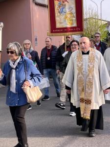 Trecate - Cerano - Devozione e tradizione si sono rinnovate nella mattinata di ieri, domenica 7 aprile, con la processione dei Trecatesi a Cerano per rendere omaggio al patrono beato Pacifico Ramati che soccorse la comunità trecatese liberandola dall'ondata di peste del bestiame nel borgo di Trecate tra il 1628 e il 1630. A questo miracolo si lega l’antica usanza, che, ogni anno, durante la Domenica in Albis, vede unirsi le due comunità: numerosi sono stati i fedeli che, in processione o con altri mezzi, guidati dal parroco don Ettore Maddalena, dal presidente Giovanni Zanotti e dagli esponenti della Consulta dei santi patroni Clemente e Cassiano, dall’assessore Fortunata Patrizia Dattrino e dal consigliere comunale Michela Cigolini in rappresentanza dell’Amministrazione, hanno raggiunto la chiesa ceranese di San Rocco, dove sono stati accolti dal parroco don Egidio Borella, dai rappresentanti dalla Fabbriceria dello Scurolo del Beato Pacifico e dal vicesindaco Monica Aina con gli assessori Mauro Cesti e Daniela Bolognino.