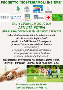 Trecate - Dal 14 giugno al 24 luglio 2021 il progetto "Sosteniamoli insieme" propone un'attività estiva qualificata per bambini con disabilità residenti a Trecate. All'Oratorio femminile in via Cesare Battisti 2, educatori e professionisti specializzati dell'associazione ACOT (Animali Coterapeuti) terranno laboratori esperienziali - artistici e sensoriali e attività assistite dagli animali come già avvenuto nell'estate 2020 con un notevole successo. I laboratori si svolgeranno il martedì, il mercoledì e il giovedì dalle 16.30 alle 19 e avranno una durata di 45 minuti per ciascun bambino. Per informazioni e iscrizioni è necessario chiamare Annalisa Ugazio al numero 338 9968710.