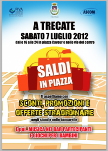 Trecate - E’ festa sabato 7 luglio a Trecate per il tradizionale appuntamento nelle vie del centro con “Saldi in piazza”, evento che si svolge da anni in occasione dell’avvio delle vendite di fine stagione. Organizzata da Ascom Trecate, in collaborazione con la Federazione degli Ambulanti e con il Patrocinio del Comune, l’iniziativa si svolgerà in piazza Cavour e nelle vie del centro, dove saranno allestiti gazebo dei commercianti trecatesi e bancarelle di alimentari e generi vari con proposte e sconti davvero speciali.