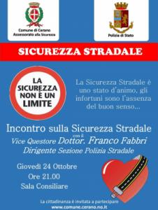 Cerano - L'assessorato alla sicurezza del Comune di Cerano e la Sezione Polizia Stradale di Novara hanno organizzato un incontro pubblico sulla Sicurezza stradale che si terrà il prossimo giovedì 24 ottobre alle ore 21 presso la Sala Consiliare "M. Aina" in piazza Crespi 12. Interverrà il Vicequestore Franco Fabbri, dirigente sezione Polstrada di Novara, che darà importanti informazioni sui comportamenti da assumere per essere più sicuri quando ci si mette alla guida o comunque si circola sulle strade; il dott. Fabbri sarà inoltre disponibile a dialogare con i presenti rispondento alle domande che eventualmente verranno poste. Si invitano i cittadini ceranesi a partecipare a questo utile incontro informativo.