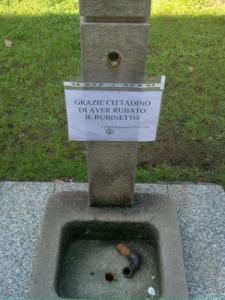 Cameri - Ci scrive l'assessore alle politiche sportive, sociali e occupazionali del Comune, Simone Gambaro: "La scorsa settimana gli operai comunali hanno installato, sulla fontanella dei giardini di piazza Dante, un rubinetto in stile di ottone. L'intervento era stato eseguito nell'ambito della riqualificazione dell'arredo urbano che l'Amministrazione comunale ha programmato. Con grande stupore la mattina dopo abbiamo constatato che il nuovo rubinetto era stato rubato. Ci è parso estremamente sgradevole e poco qualificante l'atteggiamento della persona che ha compiuto questo furto, che tra le altre cose ha anche creato un disservizio non permettendo il funzionamento dell'unica fontanella posta all'interno del giardino pubblico di piazza Dante, in un periodo di grande caldo.