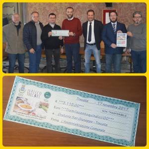 Trecate - La mattina di venerdì 17 novembre in conferenza stampa, presso la sala di Rappresentanza del Comune, l'Amministrazione comunale ha consegnato alla Parrocchia, nelle mani del Vicario parrocchiale Don Mauro Baldi, un assegno simbolico con il ricavato della manifestazione "Riso, Gorgonzola e Antichi Sapori", a favore dell’Oratorio San Giuseppe di Trecate: ben 3115 € che andranno a chi è più in difficoltà. "Grazie di cuore - afferma Andrea Crivelli, presidente del Consiglio comunale - ai tanti sponsor e partner che hanno reso possibile l'evento. Un ringraziamento a tutti i volontari e un grazie speciale all'amica Carla Borando senza il cui impegno costante e fattivo tutto questo non sarebbe stato possibile".