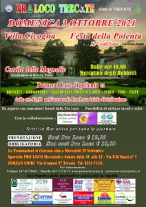 Trecate - La Pro Loco Trecate APS organizza la 17° edizione della Festa della Polenta. Il 3 ottobre nella splendida cornice di Villa Cicogna cortile delle magnolie si svolgerà il mercatino degli hobbisti dalle ore 10 alle ore 18, ingresso con green pass. Nell'area adiacente, sede della Pro Loco, con ingresso da via Clerici 1 zona ristoro con tavoli, panche e sedie ad utilizzo libero, dalle 12,30 inizierà la distribuzione della polenta con bruscitt, gorgonzola, gelato alla polenta e al gorgonzola, acqua,vino e caffè. L'asporto sarà con contenitori forniti dalla Pro Loco. Servizio Bar attivo per tutta la giornata. Saranno rispettate tutte le prescrizioni anti Covid 19 vigenti.