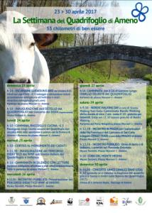 Ameno - In occasione della partenza della nuova stagione turistica, l’Amministrazione Comunale di Ameno ha organizzato una settimana ricca di eventi e proposte incentrate sul tema del turismo responsabile e sostenibile. Tutte le attività in programma si svolgeranno su tratti o anelli completi del sistema di sentieri del Quadrifoglio di Ameno, disegnati da Riccardo Carnovalini.L’intera settimana del Quadrifoglio è realizzata in collaborazione con la Pro Loco di Ameno. L’evento più importante sarà la