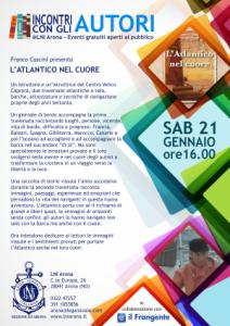 Arona - Ricominciano alla Lega Navale Italiana – Sezione di Arona, presso la sede di corso Europa n. 26, gli “Incontri con gli Autori”, eventi gratuiti aperti al pubblico. Il primo appuntamento si terrà sabato 21 gennaio 2017 alle ore 16.00 con Franco Cascini, velista ed ex magistrato, impegnato in missioni di aiuto umanitario in varie parti del mondo, che presenterà “L’atlantico nel cuore” edizioni Il Frangente, di Franco Cascini ed Elena Silvestri, velista e medico, che ha cooperato con Medici senza Frontiere e altre ONG, con la quale ha condiviso due traversate dell’Atlantico in barca a vela, con attrezzature e tecniche di navigazione proprie degli anni Settanta. L’Autore trascinerà il pubblico alla scoperta di luoghi, persone, vicende, vita di bordo, immagini, ma soprattutto emozioni, che hanno pervaso la mente e il cuore dei naviganti in un viaggio verso grandi e liberi spazi e orizzonti senza confini.