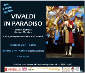 Gozzano - La rassegna “BIS! 2 laghi 2 palchi”, realizzata da La Finestra sul Lago in collaborazione con Piemonte dal Vivo, è giunta al suo quarto appuntamento e propone lo spettacolo Vivaldi in Paradiso, venerdì 26 aprile a Gozzano, presso la Somsi, e sabato 27 aprile a Baveno presso il Centro Culturale Nostr@domus, alle ore 21.