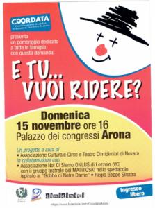 Arona - Il Coordinamento Disabilità Associazioni del territorio Aronese nasce nel 2010 come coordinamento fra l’Assessorato ai Servizi Sociali del Comune di Arona e cinque Associazioni con sede ad Arona che si occupano di disabilità, con l’intento di creare sinergia per sensibilizzare la popolazione sui temi di disabilità e handicap, promuovere eventi, reperire risorse atte a rafforzare le attività delle singole Associazioni. Coordata presenta il suo 5° evento “E tu…vuoi ridere?”, uno spettacolo teatrale messo in scena dal gruppo teatrale dei Matrioski e liberamente ispirato al “Gobbo di Notre Dame”, che sarà proposto domenica 15 novembre alle ore 16.00 al Palazzo dei Congressi di Arona con ingresso libero.