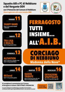 Nebbiuno - Torna la festa “Ferragosto tutti insieme…all’AIB” promossa dalla Squadra Anti Incendi Boschivi e Protezione Civile di Nebbiuno e del Vergante ODV, con il patrocinio del Comune di Nebbiuno. Sei giorni per divertirsi in compagnia, gustare diverse specialità culinarie, ascoltare e ballare buona musica. La manifestazione si svolgerà in frazione Corciago di Nebbiuno (Madonna della Neve) dall’11 al 16 agosto.