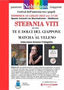 - Infine, l'incontro con Stefania Viti, che presenterà domenica 16 alle 18,00 il suo ultimo libro edito da Sonzogno "Matcha al veleno" insieme all'altro suo volume dedicato ai "Tè e dolci del Giappone", edito da Gribaudo.