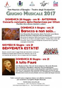 DOMENICA 18 Giugno – ore 21 – TEATRO DEGLI SCALPELLINI (S. Maurizio d'Opaglio) A tutto Fauré Con Eudossia Drei, Niccolò Scaccabarozzi, Riccardo Brumat, Coro Polifonico Stendhal e Massimo Fiocchi Malaspina. Una serata dedicata alla musica corale del grande compositore romantico francese con l'esecuzione dello splendido Requiem nella versione per soli, coro, violino e pianoforte e altri brani per coro. Protagonista il coro polifonico Stendhal della scuola di musica Dedalo che torna ospite del Giugno musicale.