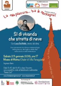 Meina - Giunge al termine il cartellone degli eventi collaterali collegati all'allestimento multimediale del Museo di Meina "Natus Est!" e dedicato alle origini del Natale, con un appuntamento intitolato "Sì di vivanda che stretta di neve" che si terrà sabato 23 gennaio alle ore 17. La citazione citazione dantesca dalla quale è mutuato il titolo, introduce l'incontro tenuto dallo storico del clima Luca Dal Bello, che avrà come tematica centrale la ricostruzione del clima nei secoli e dei principali eventi meteorologici storici del novarese e dell'areale alpino e subalpino, attraverso l'analisi di passi letterari, fonti documentali e studi scientifici. Ad affiancare Dal Bello saranno alcuni giovani che interpreteranno brani volti a sottolineare come autori e artisti hanno scritto del comportamento del clima.
