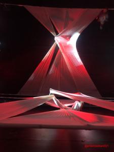 i teli ora illuminati di rosso. Al termine della performance, la coppia nel lavoro e nella vita si siede a bordo palco. Il dibattito finale con il pubblico è di vitale importanza allo stadio embrionale di uno studio di performance. Le prime curiosità del pubblico riguardano lo spazio, il dispositivo di scena. I teli sono tesi sul palco, dove agiscono i due artisti. Sopra di loro, inclinato verso il pubblico, un enorme specchio copre quasi interamente le dimensioni del palcoscenico. L’impalcatura riflette i loro movimenti, restituisce allo spettatore inebriato di immagini, gesti, colori, un piano uguale e allo stesso tempo altro rispetto a quello in cui si svolge l’azione. Risuona l’eco delle parole di Fontana: «Allo spazio viene data un’accezione anche fisica, non solo di trompe-l’oeil pittorico, ma di superficie attraversata dalla luce, costruita con la luce stessa». Il trompe-l’oeil a cui assistiamo in questo caso lo vediamo inclinato davanti ai nostri occhi: fino a quando non si percepisce l’inganno, i due corpi sembrano spostarsi e aleggiare sospesi nel vuoto.