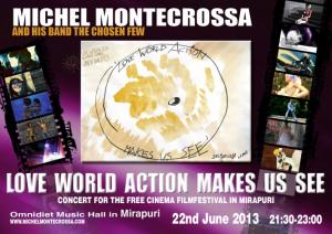 Michel Montecrossa sul Concerto ‘Love World Action Makes Us See’ Concert per il Free Cinema Filmfestival 2013 spiega: “Il concerto ‘Love World Action Makes Us See’ che suoniamo per il Free Cinema Filmfestival 2013 a Mirapuri presenta canzoni che sono come i film e canzoni prese del mio film. Sono tutte Love-World-Action-Songs ed è per quello che ti fanno vedere cosa significa essere libero, cosa significa vivere, e perche l'amore è la chiave. Venite e godetevi questi film e la musica ”