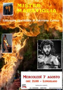 Belgirate - Appuntamento per grandi e piccini con un autentico artista di strada. La sera di mercoledì 7 agosto dalle ore 21 sul lungolago della cittadina che si affaccia a Lago Maggiore Mister Maraviglia propone un esilarante spettacolo di fachirismo... comico. Ne vedremo di tutti i colori e saremo abbagliati dai giochi... di fuoco di un vero personaggio. Info: 345 2262980 - 348 5910949 - www.wandacircus.com. Buon divertimento!