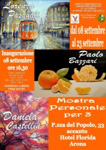 Arona - Il Laboratorio Artistico e Culturale La Fenice presenta la "Mostra Personale Per tre" in P.zza del Popolo, 33 accanto Hotel Florida Arona. La mostra, con patrocinio del Comune di Arona e a ingresso libero, resterà aperta dal 8 al 23 settembre. Pensando le giunga gradito, allego alla presente invito all'inaugurazione, sabato 8 settembre alle ore16.30. Esporranno gli artisti Lorenza Pasquali di Milano, Paolo Bazzari di Vigevano (Pavia) e Daniela Castellin di Domodossola. Questo evento artistico segue molti altri di crescente successo, come quello dell'estate del 2017, in cui presenziò all'inaugurazione anche il prof. Vittorio Sgarbi.