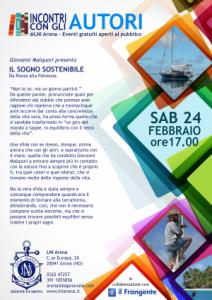 Arona - Proseguono alla Lega Navale Italiana – Sezione di Arona, corso Europa n. 26, gli “Incontri con gli Autori”, gratuiti e aperti al pubblico, in occasione dei quali velisti/scrittori racconteranno le proprie esperienze di vita e di navigazione. Dopo Claudio Menichini con la sua esilarante “Frittata di zucchine”, il 24 febbraio 2018, alle ore 17.00, sarà il momento di Giovanni Malquori, musicista e viaggiatore, con “Il sogno sostenibile. Da Ponza alla Polinesia”, un giro del mondo a tappe, tra i colori e i silenzi della natura, la realizzazione di un sogno costruito con fatica e dedizione, che non vuole essere una fuga, ma che è inserito nella realtà, in equilibrio con il resto della vita. Questo e tanto altro alla Lega Navale di Arona: per maggiori informazioni potete visitare il sito www.lnirona.it oppure contattare la segreteria via mail all’indirizzo arona@leganavale.it o chiamando ai numeri 0322 47257 oppure 391 1055856.