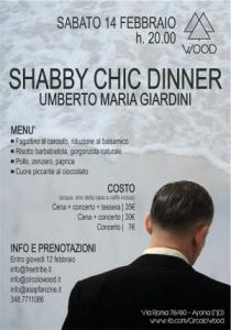 Menù: Fagottino al carciofo, riduzione al balsamico; Risotto barbabietola, gorgonzola naturale; Pollo, zenzero, paprica; Cuore piccante al cioccolato. Costo della cena (acqua, vino della casa, caffè inclusi): Cena + concerto + tessera: € 35,00; Cena + concerto: € 30,00; Concerto: € 7,00.