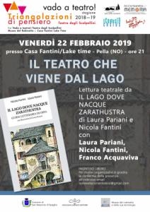 Pella - Venerdì 22 febbraio a Pella (NO), alle ore 21 nella prestigiosa cornice di Casa Fantini/Lake time (via Roma 2, www.casafantinilaketime.com/it/), si svolgerà una lettura teatrale a partire dal libro di Laura Pariani e Nicola Fantini Il lago dove nacque Zarathustra. Guida letteraria a Orta (Interlinea, pp. 88, euro 12). Con gli autori sarà presente Franco Acquaviva. Ingresso libero (per motivi organizzativi è gradita la conferma della presenza: isolenellacorrentealzo@gmail.com). Invito in allegato.