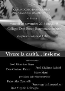 Borgomanero - Dedicato a don Angelo Mattiello il libro “Vivere la carità... insieme”. Mario Metti, curatore insieme a Giannino Piana del volume, ha deciso di rendere omaggio al compianto salesiano scomparso all'inizio di ottobre qualche giorno dopo aver festeggiato il mezzo secolo di ordinazione sacerdotale. Originario di Torri di Quartesolo, in provincia di Vicenza, avrebbe compiuto 81 anni il 6 dicembre. Da 28 era parroco di Vergano, frazione di Borgomanero; inoltre era rettore del santuario di Maria Ausiliatrice al collegio “Don Bosco” di Borgomanero. L'opera, che chiude una trilogia sulle virtù teologali, verrà presentata venerdì 28 alle 20,45 nell'aula magna proprio del collegio dove interverranno, oltre a Metti e Piana, l'editore Giuliano Ladolfi e il direttore dell'istituto Giuliano Palizzi. I loro contributi saranno intervallati dalla videoproiezione delle interviste che Metti ha realizzato, nei mesi scorsi, a Lampedusa, alla gente che accoglie i migranti; a padre Alex Zanotelli, che da ormai un decennio vive nel rione Sanità di Napoli; e a don Virginio Colmegna, presidente della “Casa della carità” di Milano. La serata sarà arricchita dalle note del chitarrista Roberto Barcellini. Il libro è in vendita a venti euro. Possibile anche acquistare, insieme a “Vivere la carità... insieme”, anche l'opera precedente intitolata “Rivisitare la fede... insieme”: in questo caso il prezzo complessivo dei due volumi è di trenta euro. I proventi andranno interamente all'associazione Mamre onlus che gestisce la casa di accoglienza “Piccolo Bartolomeo” che ospita donne vittime di violenza e, più in generale, in situazioni di difficoltà, e i loro bambini. «”Vivere la carità... insieme” - puntualizza Metti - parla della Carità, cioè dell’Amore, l’essenza della nostra vita che è stata illustrata dalle pagine scritte, con viva passione, da tanti amici. E poi non manca una lunga serie d'interviste “con testimoni del nostro tempo realizzate in luoghi simbolo di sofferenze e d'ingiustizie”, come scrive il prevosto di Borgomanero don Piero Cerutti nella prefazione». Verrà allestita anche una mostra fotografica che documenterà gli incontri che Metti ha avuto nei mesi scorsi da Milano a Napoli e Palermo passando da Montefano, Lampedusa e Acerra. «Ci sarà la possibilità - conclude - di conoscere delle realtà per molti forse sconosciute. Quel ch'è certo è che abbiamo bisogno di tutti perché solo “insieme” possiamo aiutarci a far sì che l’Amore sia davvero vissuto e trasmesso a ogni persona».
