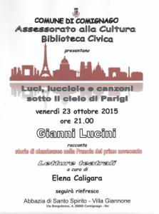 Comignago - Venerdì 23 ottobre alle ore 21 arriva all'Abbazia di Santo Spirito - Villa Giannone a Comignago, un luogo bellissimo che ha goduto un periodo di grande popolarità per aver ospitato il matrimonio di Belen Rodriguez, quello che ormai viene definito “Neverending Tour” (Tour senza fine) del libro “Luci, lucciole e canzoni sotto il cielo di Parigi”. La chiacchierata dell’autore del libro Gianni Lucini, organizzata dall’Assessorato alla Cultura e dalla Biblioteca Civica di Comignago, sarà accompagnata dalle letture dell'attrice Elena Caligara.