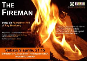 Romagnano Sesia - Sabato 9 aprile ultimo appuntamento con la rassegna di lettura teatrale-musicale per adulti in biblioteca a Romagnano Sesia. Il titolo della serata è “The Fireman” tratta da "Fahrenheit 451", il distopico romanzo-capolavoro di Ray Bradbury. Un mondo dove i pompieri non spengono incendi. Li appiccano. Un mondo dove i libri sono illegali. E vengono bruciati. Un mondo dove qualcuno è disposto a ribellarsi al sistema. Adattamento e voce narrante Andrea Piazza. Musiche e chitarra Samuele Badino; Basso Federico Pallone. Collaborazione Janira Salice. Un evento organizzato dall’Assessorato all’Istruzione in collaborazione con la Biblioteca.