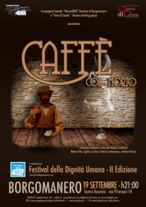 Sempre Sabato 19 settembre, ma alle 21, al Teatro Rosmini, andrà in scena “Caffè col morto” (nella foto la locandina), spettacolo della Compagnia Teatrale Musicalbox di Borgomanero e Servi di Scena. La commedia, in due atti, è un piccolo spaccato della società odierna, raccontato ai tavoli di un bar. Ideato e scritto da Matteo Riva, Egidio La Gioia, Antonio Santomauro e Andrea Pastore, lo spettacolo è un “personale racconto del lavoratore di oggi, in precario equilibrio tra le conquiste o le sconfitte di ieri e le sfide di domani”.