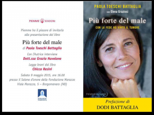 Borgomanero - Sabato 9 maggio alle ore 16 nel Salone d'onore si terrà un incontro con Paola Toeschi Battaglia sul suo libro “Più forte del male”, una commovente testimonianza di dolore, di fede e di vittoria sulla malattia. Paola Toeschi, borgomanerese, è moglie di Dodi Battaglia chitarrista dei Pooh. Sarà presentata da Grazia Nuvolone psicoterapeuta. Brani dal libro saranno letti da Chicca Resini. Appuntamento dunque alla Fondazione A. Marazza Onlus, viale Marazza 5 a Borgomanero (No). Info: 0322 81485 - www.fondazionemarazza.it.