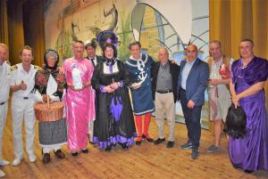Borgomanero - La Sciora Togna (Tiziano Godio) e la “sarventa” Carulena (per l’occasione interpretata da Guido Vicario) hanno incontrato, al termine dello spettacolo “I Colombo viaggiatori”, la compagnia de “I Legnanesi” e i principali interpreti: la Teresa (Antonio Provasio), il Giovanni (Luigi Campisi) e la Mabilia Enrico Dalceri). Il tutto è accaduto mercoledì 12 aprile al Teatro Nuovo di Borgomanero. Dopo l’incontro virtuale dello scorso anno tra le due Signore la Togna e la Teresa, Sergio Poletti della Palzola aveva regalato il volume “Togna mirabolante dal retro strabiliante” agli attori, ecco concretizzarsi il sogno delle due primedonne: un rendez-vous in pompa magna. Così dopo il successo di pubblico, la “Togna” con la fedele “Carulena” è salita sul palcoscenico e ha omaggiato gli attori con i prodotti locali: il vino delle colline borgomaneresi, i salamini e i brutti ma buoni. L’inarrestabile “Togna” ha esibito, orgogliosamente, anche la terza meraviglia della Città: dopo la Madonna di Piazza Martiri, il ponte sull’Agogna ecco il retro strabiliante, suscitando l’apprezzamento del pubblico. La Teresa, dopo aver illustrato i cioccolatini al Palzola, ha ringraziato i due personaggi del “settembre borgomanerese” annunciando una visita “privata”, cosa che regolarmente è stata attuata il giorno successivo, il 13 aprile, giornata di “replica” dello spettacolo al Nuovo. Da sottolineare il successo della piece: due serate con il tutto esaurito e grande divertimento del pubblico. Il testo dello spettacolo è di grande attualità: la storia, ambientata come sempre in un cortile, vede i “soliti problemi” attanagliare la famiglia Colombo: Nonostante questo la grande generosità di Teresa, Giovanni e Mabilia ha portato loro ad adottare un bambino brasiliano. La curiosità di conoscere i propri genitori e la ”sorella” adottivi è tale da portare Paolo Roberto Josè Amarildo Santos Do Nascimiento detto Gegè a raggiungerli per una vacanza in Italia. L’accoglienza della famiglia sarà in perfetto stile Colombo: affettuosa, coinvolgente e divertente tanto da spingere Gegè ad invitare Teresa, Giovanni e Mabilia in Brasile. Il ritorno dal Brasile vede i protagonisti salpare su una a nave da crociera e … navigare in un mare di risate.
