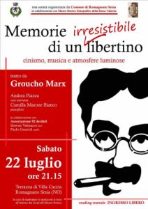 Romagnano Sesia - Debutta sulla terrazza di Villa Caccia, in una splendida cornice di teatro sotto le stelle, il reading "Memorie di un irresistibile libertino" che porta in scena, tra giochi di parole e inseguimenti musicali, la comicità cinica, irriverente, caustica di Groucho Marx. L'appuntamento è per sabato 22 luglio alle ore 21:15 con ingresso libero e gratuito. In scena due scanzonati artisti che sembrano usciti da un vecchio film di inizio secolo decimonono: un attore e una pianista, in dialogo, non sempre in accordo. Sono Andrea Piazza (regia e voce narrante) e Camilla Marone Bianco (musiche e pianoforte). Alle luci Simone Valmacco e all'audio Paolo Grazioli, dell'Associazione 92 decibel.