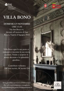 Vaprio d'Agogna - La Delegazione FAI di Novara è lieta di invitarVi all’evento “Visita esclusiva a Villa Bono”, un’esclusiva visita guidata all’interno di questo antico edificio. L’iniziativa si terrà domenica 9 novembre a partire dalle ore 15 su turni, con il ritrovo fissato presso Via San Rocco 6, Vaprio d'Agogna - Novara (davanti all'oratorio di San Rocco). In questa speciale occasione, Villa Bono apre le sue porte ai visitatori e racconta la sua storia secolare. Al suo interno sarà possibile ammirare le stanze finemente decorate ed affrescate e lo splendido e vasto giardino.