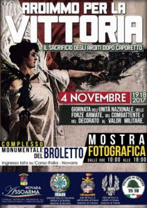 Novara - Il 4 Novembre 2017 dalle 10 alle 18, in occasione della Giornata dell'Unità Nazionale, delle Forze Armate, del Combattente e del Decorato al Valore Militare, si terrà sotto i portici del Broletto di Novara la mostra fotografica "Ardimmo per la Vittoria! Il sacrificio degli Arditi dopo Caporetto". L'evento è organizzato da AssoArma Novara, nel quadro degli eventi istituzionali del Comune di Novara, in stretta collaborazione con l'Unione Nazionale Italiana Reduci di Russia (Sezione di Novara), l'Associazione Nazionale Artiglieri d'Italia (Sezione di Cerano), la Federazione Nazionale Arditi d'Italia (Sezione di Trieste, Istria, Fiume e Dalmazia) ed il Progetto "15-18 Italiani in Trincea". Considerato l'alto valore morale e culturale dell'iniziativa, coincidente con una data - il 4 Novembre - importante la Comunità nazionale, il Centro Studi e Documentazione "Giovanni Pompa e Francesco Rapellini" invita la cittadinanza a partecipare numerosi a questo evento.