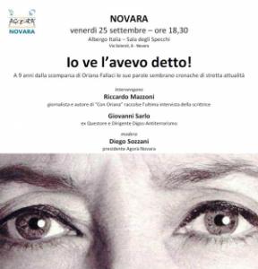 Novara - "E' davvero con grande piacere - afferma Diego Sozzani, consigliere regionale e coordinatore provinciale di Forza Italia - che vi rinnovo l'invito a partecipare all'incontro che l'Associazione Agorà Novara ha coordinato per parlare di un tema di strettissima attualità e con personalità di significativo spessore. Si tratta di Riccardo Mazzoni, giornalista già direttore de "Il Giornale della Toscana", che raccolse l'ultima intervista rilasciata da Oriana Fallaci e che con la segretaria particolare della scrittrice pubblicò il libro "Con Oriana". Con lui l'ex questore di Novara ed ex dirigente della Digos sezione antiterrorismo, Giovanni Sarlo". L'incontro, che sarà moderato dallo stesso Sozzani, si svolgerà a Novara presso la Sala degli Specchi dell'Albergo Italia venerdì 25 settembre alle ore 18,30. Il tema dell'incontro è "Io ve l'avevo detto! - A nove anni dalla scomparsa di Oriana Fallaci le sue parole sembrano cronache di estrema attualità".