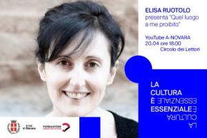 Novara - Evento online sul canale YouTube A-Novara https://bit.ly/3jUCRMf. Nell'ambito del progetto del Comune di Novara La cultura è essenziale: incontro organizzato dal Circolo dei lettori, registrato al Circolo dei Lettori. Elisa Ruotolo presenta "Quel luogo a me proibito" (Feltrinelli).