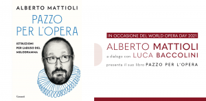 Lunedì 25 Ottobre in occasione del World Opera Day 2021 Alberto Mattioli presenta il suo libro "Pazzo per l'opera" (nella foto, ed. Garzanti) a dialogo con Luca Baccolini.