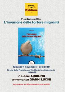 Novara - Giovedì 11 novembre alle ore 21 al Circolo della Fratellanza di Novara in via Monte San Gabriele 15 Aquilino conversa con Gianni Lucini del suo ultimo libro "L'invasione delle tortore migranti" edito da Segni e Parole. Devono lasciare il luogo natio. Fuggono da guerra, miseria, fame. Superano catene montuose, attraversano mari. Vogliono sopravvivere. S’insediano in quello che a loro sembra un eden, una cittadina di nome Livellate. Gli abitanti sono pacifici, è vero, ma quando si sentono invasi… La presenza sempre più numerosa delle tortore viene vissuta come una minaccia alla quale bisogna reagire con tutti i mezzi, in difesa della civiltà e del territorio. Le strategie adottate provocano vittime alate e umane, in un gioco al massacro che contraddice i valori conclamati. L’ipocrisia della politica apre le porte agli odiatori di professione, manovrati da chi vuole dominare. A Livellate c’è bisogno di umanità. Una scrittura agile, leggera e divertente, metafora di una tragedia storica in un libro di 112 pagine in vendita a 12 Euro.