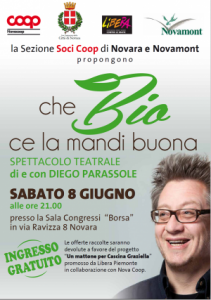 Alla sera alle 21 nella Sala Congressi del "Borsa" in via Ravizzza 8 si tiene invece lo spettacolo teatrale di e con Diego Parassole "Che bio ce la mandi buona". L'ingresso è gratuito; le offerte raccolte saranno devolute a favore del progetto "Un mattone per Cascina Graziella", promosso da Liobera Piemonte in collaborazione con Nova Coop. La piéce è promossa anche da Comune, sezione soci Coop di Novara e Novamont. Libera - associazioni, nomi e numeri contro le mafie ha sede a Novara in via Monte Ariolo 10. Info: http://novara.liberapiemonte.it.