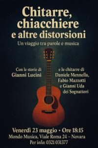Novara - Il 23 maggio alle ore 18.15 a Mondo Musica di Novara in Viale Roma 24 si tiene la “prima” dello spettacolo “Chitarre, chiacchiere e altre distorsioni”, un viaggio tra parole e musica con le storie di Gianni Lucini e le chitarre di Daniele Mennella, Fabio Mazzotti e Gianni Uda dei Sognattori. L’ingresso è libero fino a esaurimento posti. Sette storie e sette brani musicali per cullare la fantasia degli spettatori in un mondo nemmeno troppo immaginario nel quale la musica è l’unica protagonista anche quando lascia spazio alle parole. Per ulteriori info: 0321 031377.