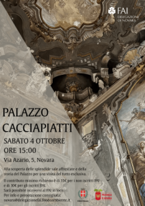 Novara - La Delegazione FAI di Novara è lieta di invitarVi all’evento “Visita esclusiva di Palazzo Cacciapiatti” di sabato 4 ottobre 2025 alle ore 15:00 (ritrovo fissato in Via Azario 5, Novara), organizzato in collaborazione con il Tribunale di Novara. L’iniziativa permetterà ai visitatori di scoprire questo splendido palazzo, solitamente inaccessibile al grande pubblico.