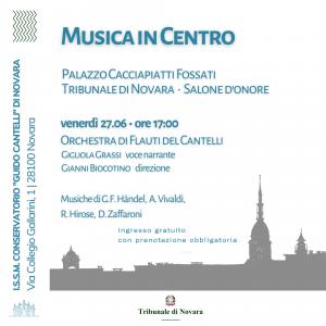 Novara - Secondo appuntamento per la rassegna “Musica in centro” in Palazzo Cacciapiatti Fossati, sede del Tribunale di Novara. Dalle ore 17 di venerdì 27 giugno l’Orchestra di Flauti del Conservatorio Cantelli, con la voce narrante di Gigliola Grassi e la direzione di Gianni Biocotino, proporrà un itinerario attraverso musiche di G.F. Händel, A. Vivaldi, R. Hirose, D. Zaffaroni. L'ingresso è libero fino ad esaurimento posti; per prenotazioni: www.eventbrite.it/e/biglietti-musica-in-centro-una-favola-diflauti-1411734960269?aff=oddtdtcreator.