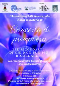 Tornaco - Venerdi 3 maggio dalle ore 21 al Teatro di Tornaco (Via Girella 2)) i musicisti novaresi Federica Arestia, Claudio Macaluso, Raffaele Fiore (Flos), Mario Giordano, insieme ad altri artisti, si esibiranno in un concerto di raccolta fondi e sensibilizzazione: il Concerto di Primavera. Tutto l’incasso, dedotte le spese, sarà destinato ai progetti di A.M.A. (Associazione Malati Alzheimer) Novara Onlus. Il costo del biglietto è di 10 euro. L’evento è sostenuto e patrocinato dal Comune di Tornaco, con il contributo di Immagina SRL di Novara.