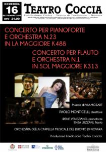 Novara - La sera di domenica 16 settembre, alle ore 21, al Teatro Coccia di Novara ci sarà un importante evento promosso dalla Fondazione Amici della Cattedrale. In programma un Concerto per pianoforte e orchestra di Mozart K488 e un Concerto per flauto e orchestra K313 sempre di Mozart con solista Enea Luzzani. Sul palco avremo modo di vedere Irene Veneziano al pianoforte ed Enea Luzzani al flauto e l'Orchestra della Cappella Musicale del Duomo di Novara; dirige il maestro Paolo Monticelli.