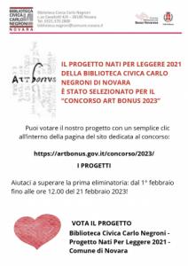 Novara - Il Progetto Nati per Leggere 2021 della Biblioteca Civica Carlo Negroni di Novara è stato selezionato per il “Concorso Art bonus 2023”. Il progetto può essere votato con un semplice clic all’interno della pagina del sito dedicata al concorso: https://artbonus.gov.it/concorso/2023/ https://artbonus.gov.it/concorso/2023/progetti/?cerca=novara®ione=&provincia=&ente= da oggi, 1° febbraio 2023, fino alle ore 12 del 21 febbraio 2023. Il Concorso Art Bonus è organizzato dal Ministero della cultura, ALES Spa e Promo PA Fondazione–LuBeC allo scopo di promuovere una sempre più diffusa conoscenza dell’Art Bonus (legge n. 106/2014), la misura fiscale introdotta per incentivare le donazioni a favore della cultura attraverso un beneficio fiscale del 65%. E' stato ideato nel 2016 con l’obiettivo di premiare l’impegno di quanti, beneficiari e mecenati, rendono possibile attraverso l’Art Bonus il recupero e la valorizzazione del patrimonio culturale del nostro Paese. Ogni anno sul portale governativo Art Bonus vengono selezionati i progetti che nell’ultimo anno hanno chiuso con successo una loro raccolta fondi Art Bonus, e questi progetti vengono inseriti nella pagina del sito dedicata al concorso dove avvengono le votazioni nella prima fase, cui segue una finale che si tiene solo sui canali social di Art Bonus. Dal lancio del concorso e fino al termine delle votazioni circa 2 mesi dopo, chiunque può accedere alla piattaforma del concorso ed esprimere il proprio voto a favore di uno o più progetti in vetrina. Un modo per condividere e dare popolarità ai tanti diversi progetti che si stanno realizzando in tutta Italia grazie all’Art Bonus, sempre più sentito proprio dai cittadini non solo come un bonus fiscale ma anche come un’opportunità per esprimere riconoscenza verso le istituzioni del proprio territorio e condividere i valori della cultura.