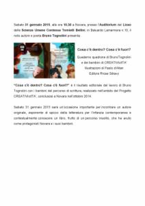 Novara - Sabato 31 gennaio alle ore 10.30 a Novara, presso l’Auditorium delle Scienze Umane Contessa Tornielli Bellini, Baluardo Lamarmora n. 10, il noto autore e poeta Bruno Tognolini (autore di programmi televisivi, quali l’Albero Azzurro e la Melevisione; di 42 libri per bambini e Premio Andersen nel 2007 e 2011) presenta il libro “Cosa c’è dentro? Cosa c’è fuori?”, illustrato da Paolo d’Altan ed edito da Rose Sélavy. Un’occasione importante per incontrare un autore originale, esponente di spicco della letteratura per l’infanzia contemporanea e contestualmente conoscere un libro, frutto di un percorso insolito, che ha avuto come protagonisti Novara e i suoi bambini. “Cosa c'è dentro? Cosa c'è fuori?”è il risultato editoriale del lavoro di Bruno Tognolini e dei bambini del percorso di scrittura, realizzato nell’ambito del Progetto CREATIVIcitTA’, conclusosi a Novara nell’ottobre 2014. "CREATIVIcitTA’, nuovi percorsi per nuovo pubblico", progetto del Comune di Novara - Assessorato alla Cultura, è stato ideato e sviluppato da Enrico Trevisan e Marta Visca, cofinanziato da Fondazione Cariplo con partner Fondazione Teatro Coccia e Dedalo Soc. Coop. Sociale.